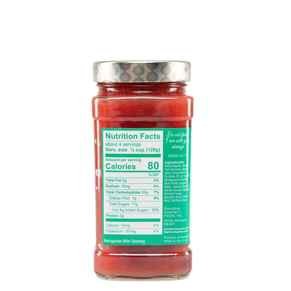 Cherry Vanilla Big Slice: Sweet red cherries and chunky big slices of apple are complemented by the warm, rich flavor of real Madagascar vanilla, comfort in a jar. Yummy enough to be breakfast or dessert.